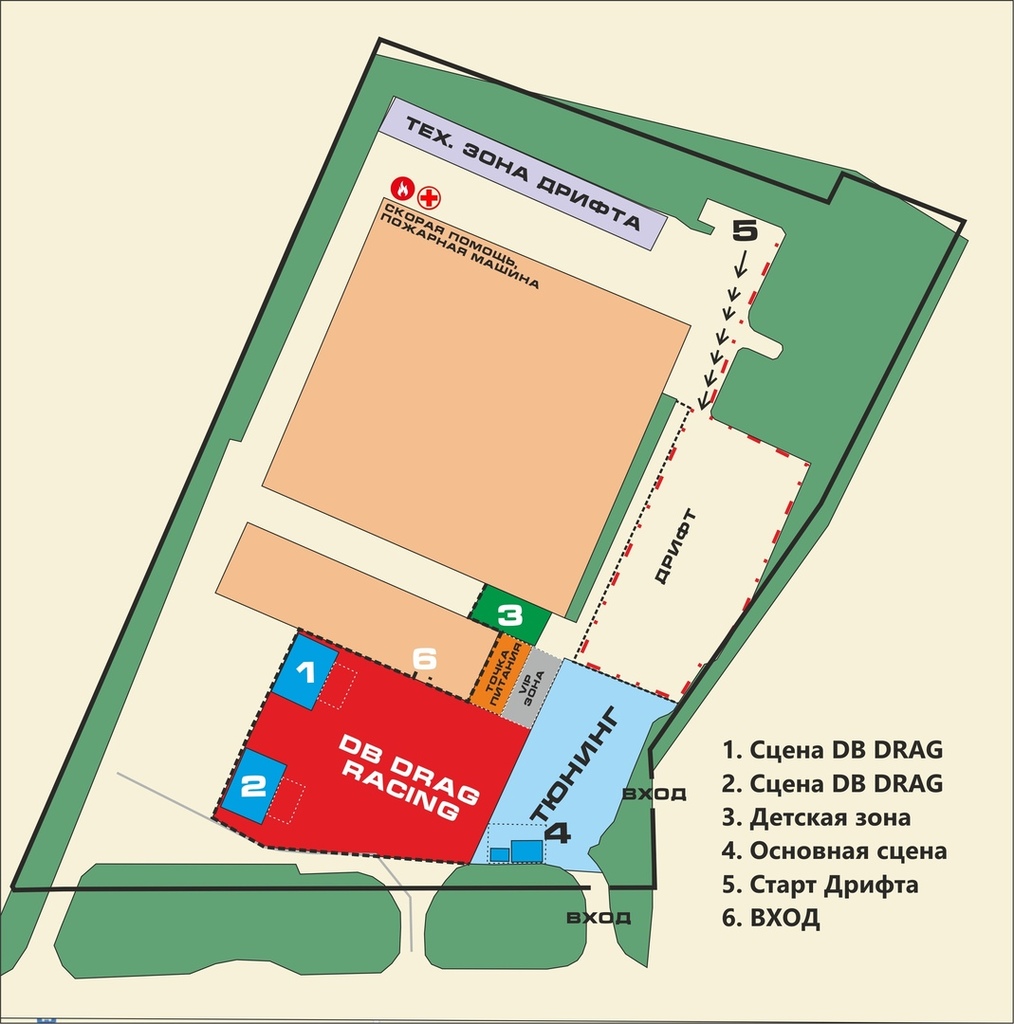 Всего есть 2 сцены dB Drag Racing - возле «Сцены №1» размещаются участники классов Street Stock. Классы Street Trunk, Super Street и Extreme размещаются возле «Сцены №2»