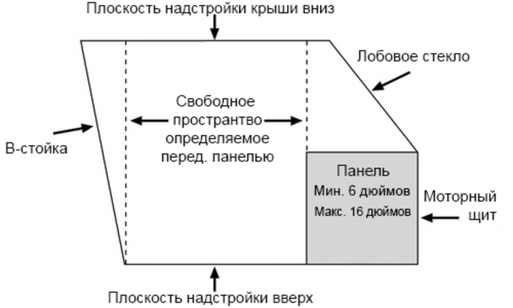 • Панель должна быть абсолютно цельной (без отверстий или проемов) и должна идти в продольном направлении от стенки моторного отсека до задней кромки панели и в поперечном направлении от стойки лобового стекла на водительской стороне до стойки лобового стекла на пассажирской стороне. |