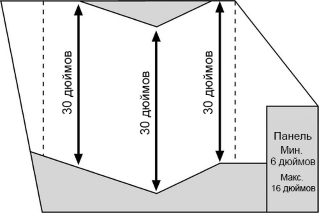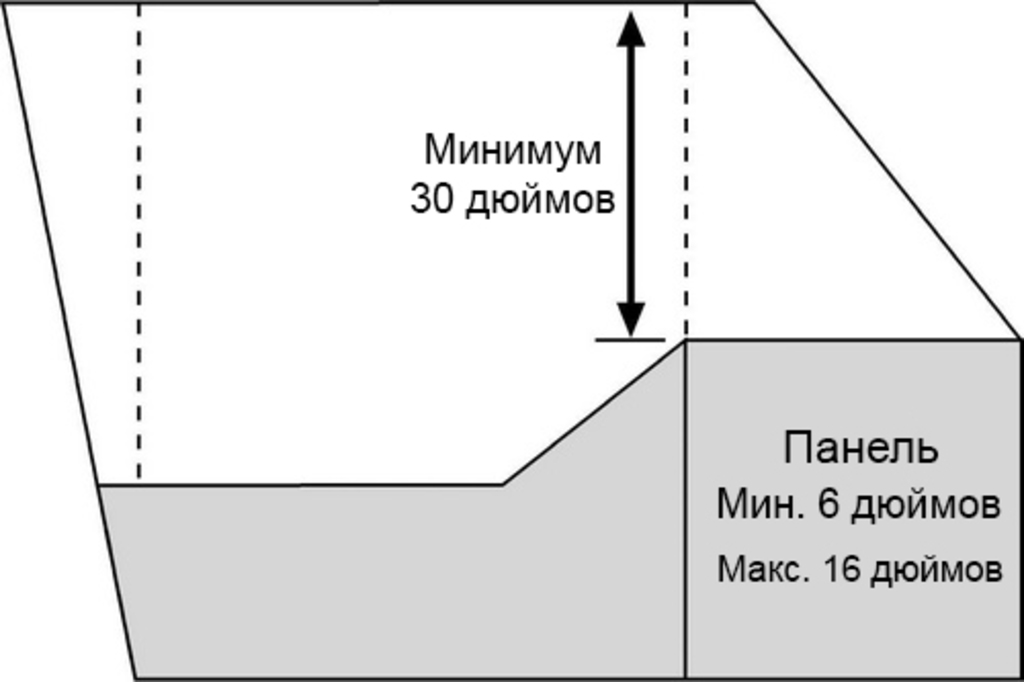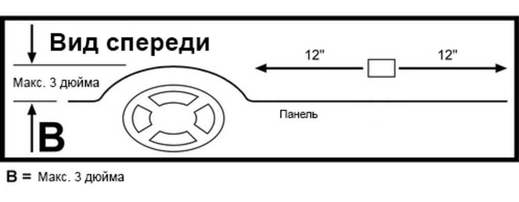 На рисунке: • Плоскость панели, ограничиваемая стенкой моторного отсека спереди, задней кромкой панели сзади, и на расстоянии 12 дюймов влево и 12 дюймов вправо (в горизонтальной плоскости) от места расположения датчика должна быть совершенно плоской по отношению к земле.